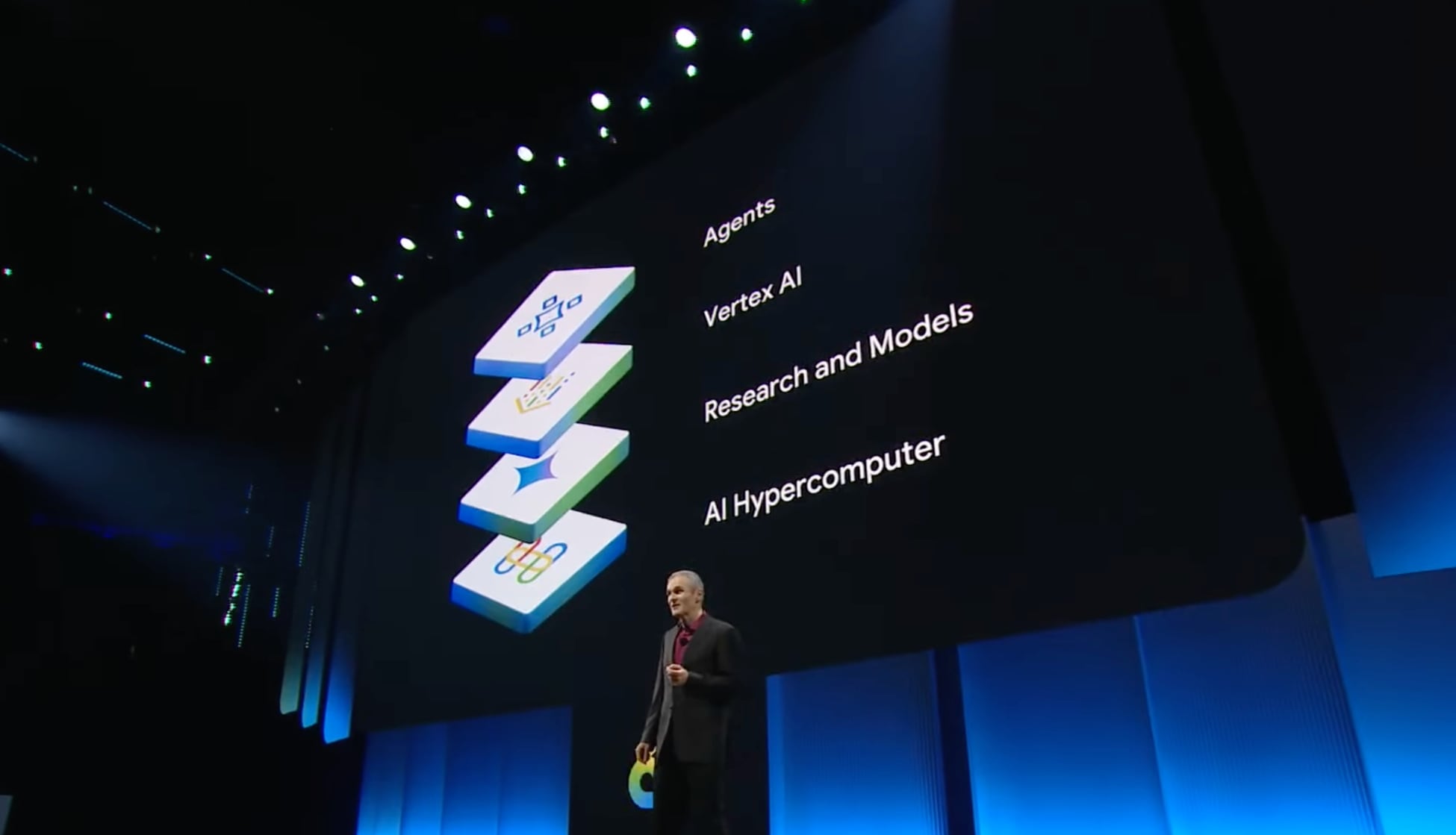 AI Hypercomputer, Research and Models, Vertex AI, Agents 이 네 단계의 스택으로 설명했다.